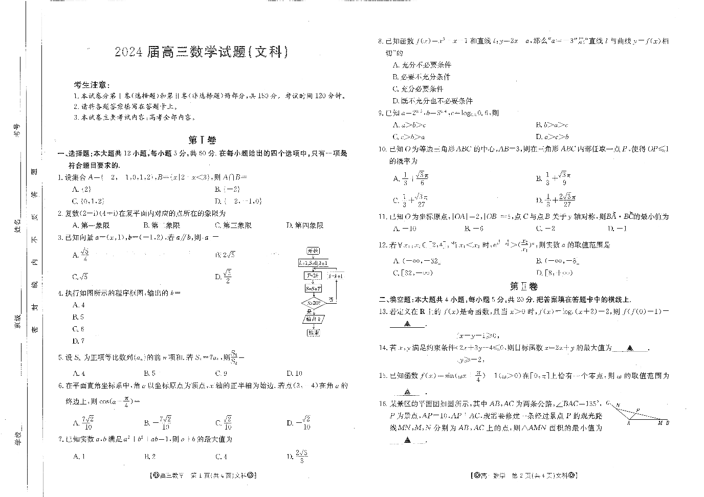 四川省雅安市联考2024届高三上学期12月联考文科数学