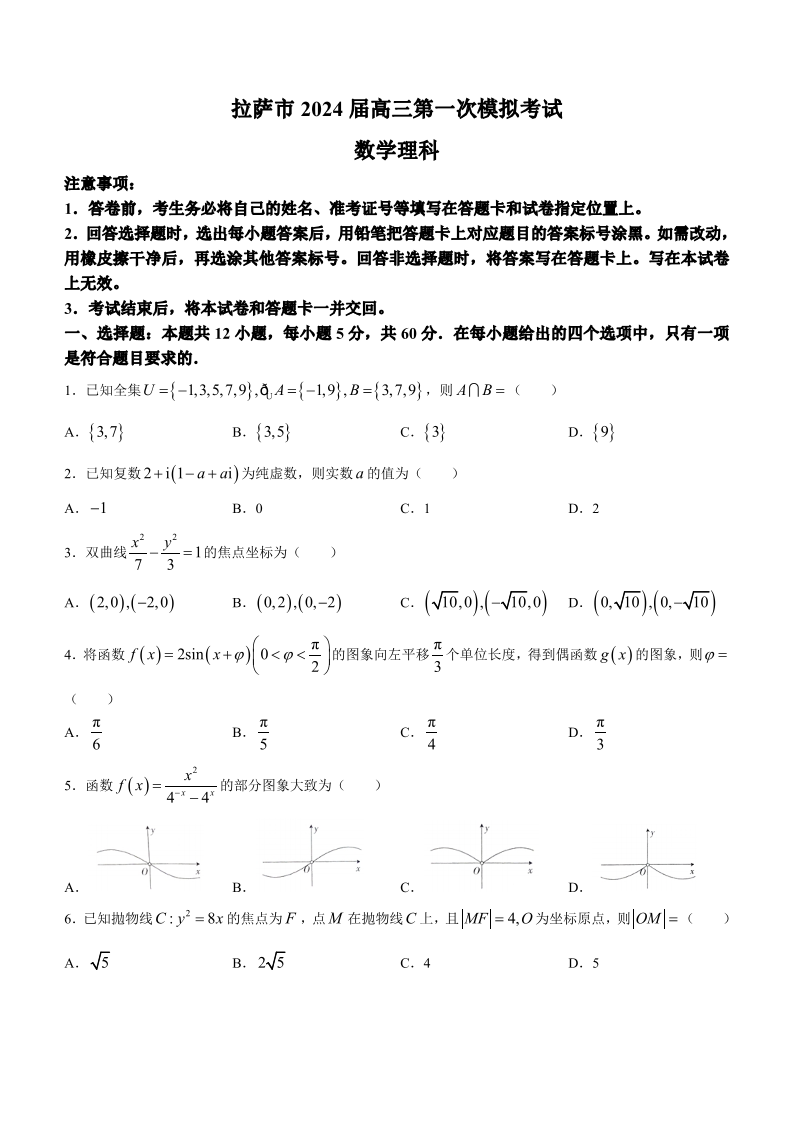 西藏自治区拉萨市2024届上学期第一次模拟考试理科数学