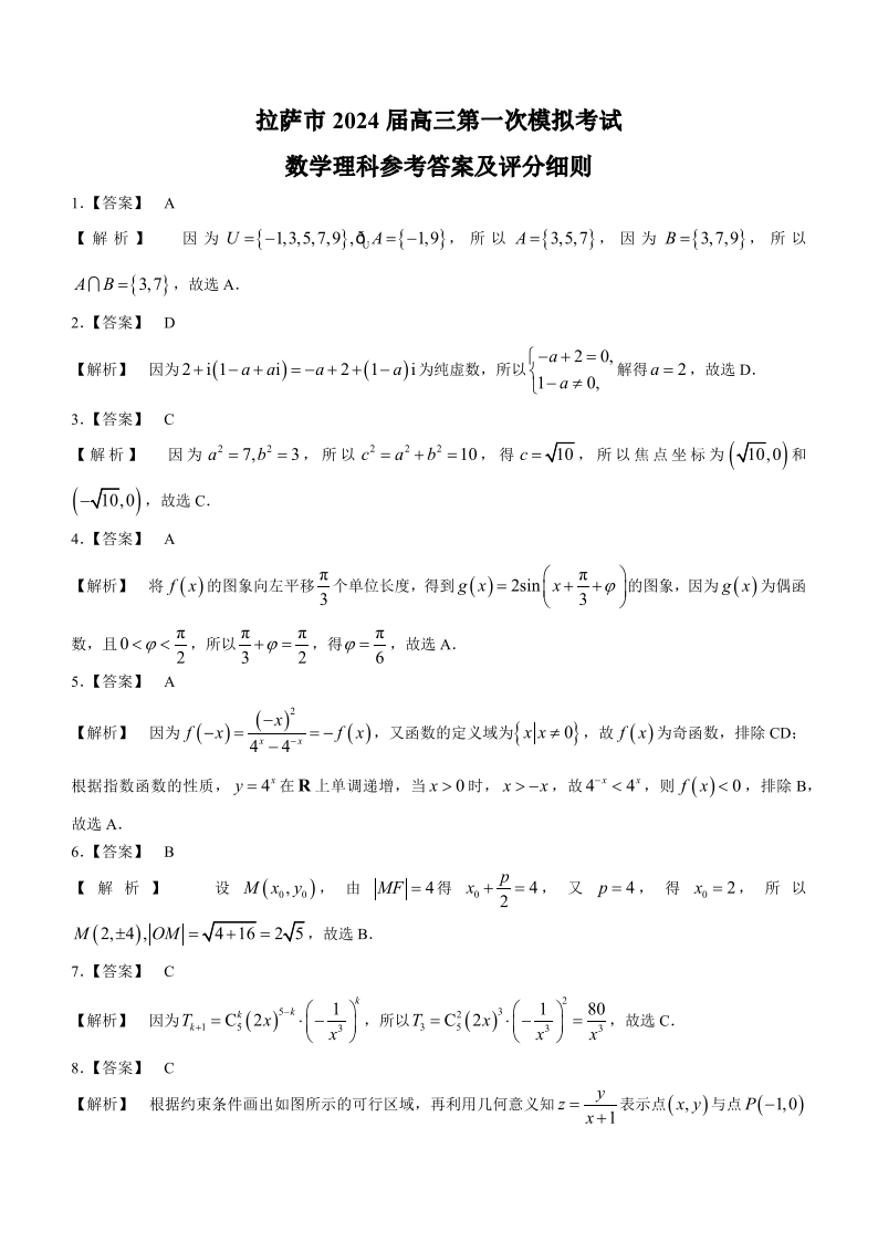 西藏自治区拉萨市2024届上学期第一次模拟考试理科数学答案
