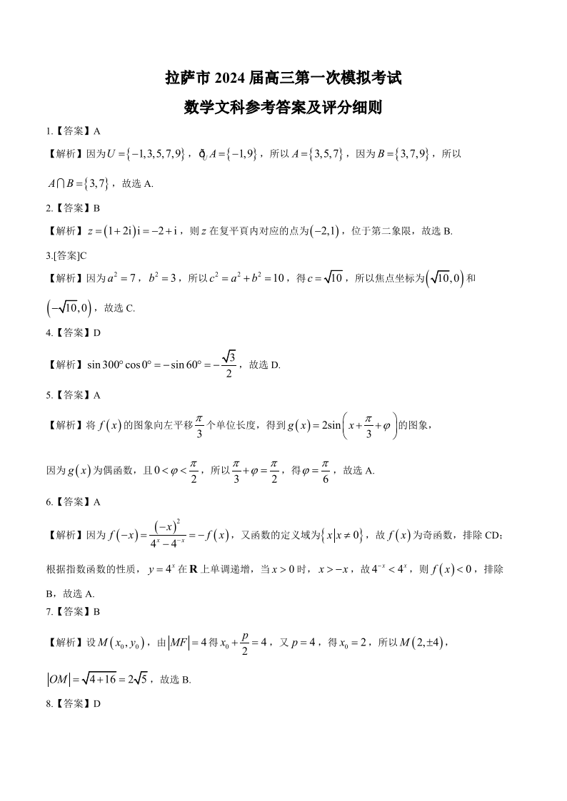 西藏自治区拉萨市2024届上学期第一次模拟考试文科数学答案