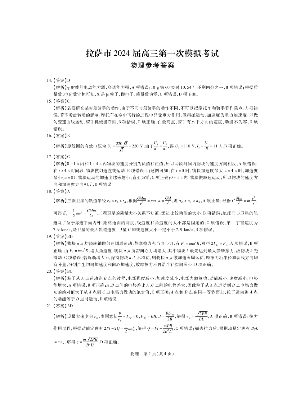 西藏自治区拉萨市2024届上学期第一次模拟考试理综物理答案