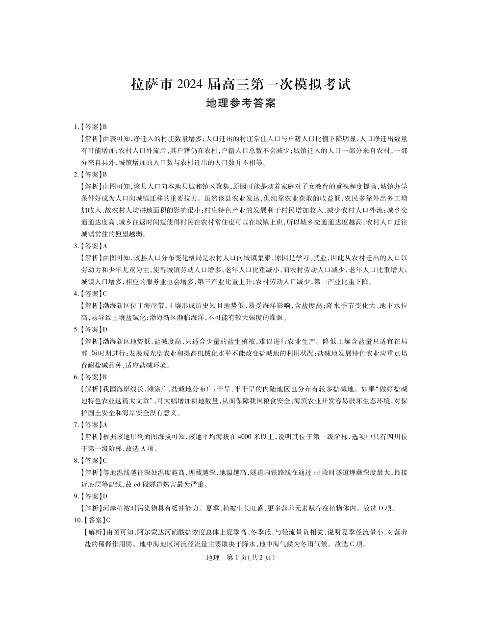 西藏自治区拉萨市2024届上学期第一次模拟考试文综地理答案