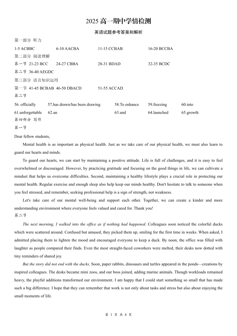 山东名校考试联盟2024-2025学年下学期4月高一期中联考英语答案