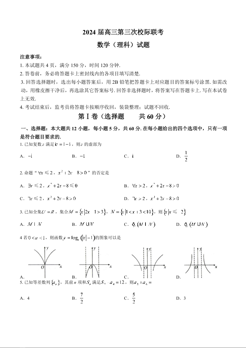 陕西省汉中市2024届高三上学期第三次校际联考理科数学含答案