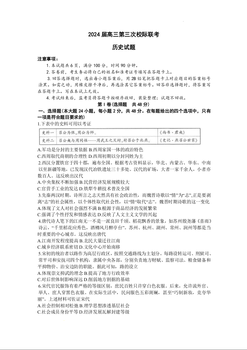 陕西省汉中市2024届高三上学期第三次校际联考历史含答案