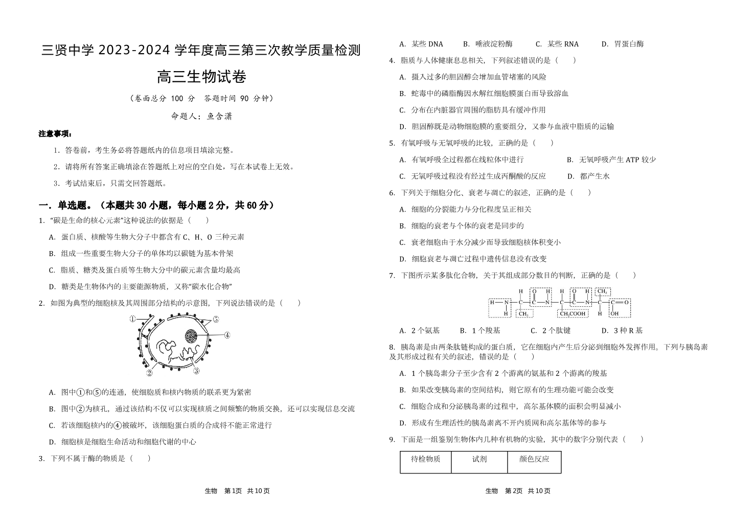 陕西省渭南市三贤中学2023-2024学年高三上学期11月月考生物