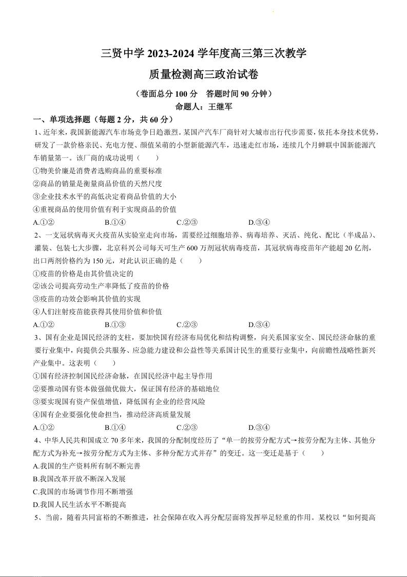 陕西省渭南市三贤中学2023-2024学年高三上学期11月月考政治