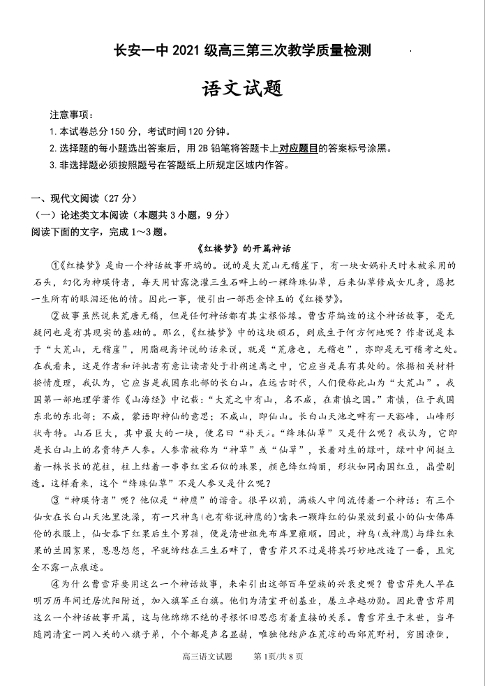 陕西省西安市长安区第一中学2024届高三上学期第三次教学质量检测语文