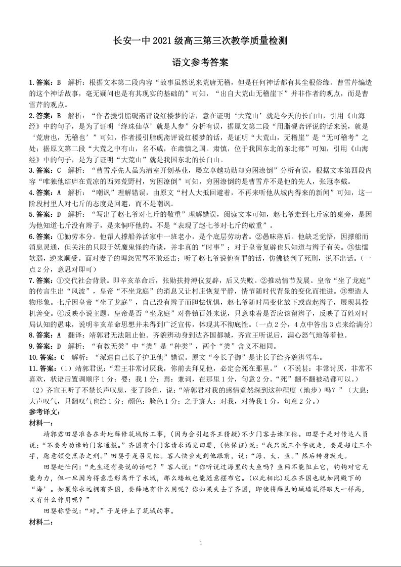 陕西省西安市长安区第一中学2024届高三上学期第三次教学质量检测语文答案