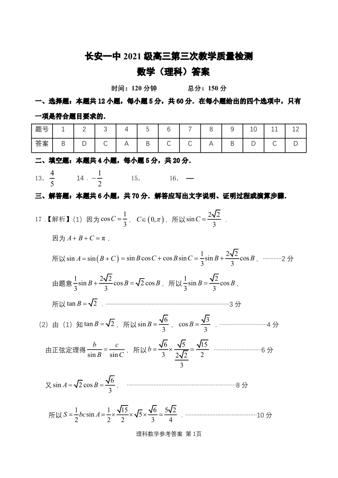 陕西省西安市长安区第一中学2024届高三上学期第三次教学质量检测理科数学答案