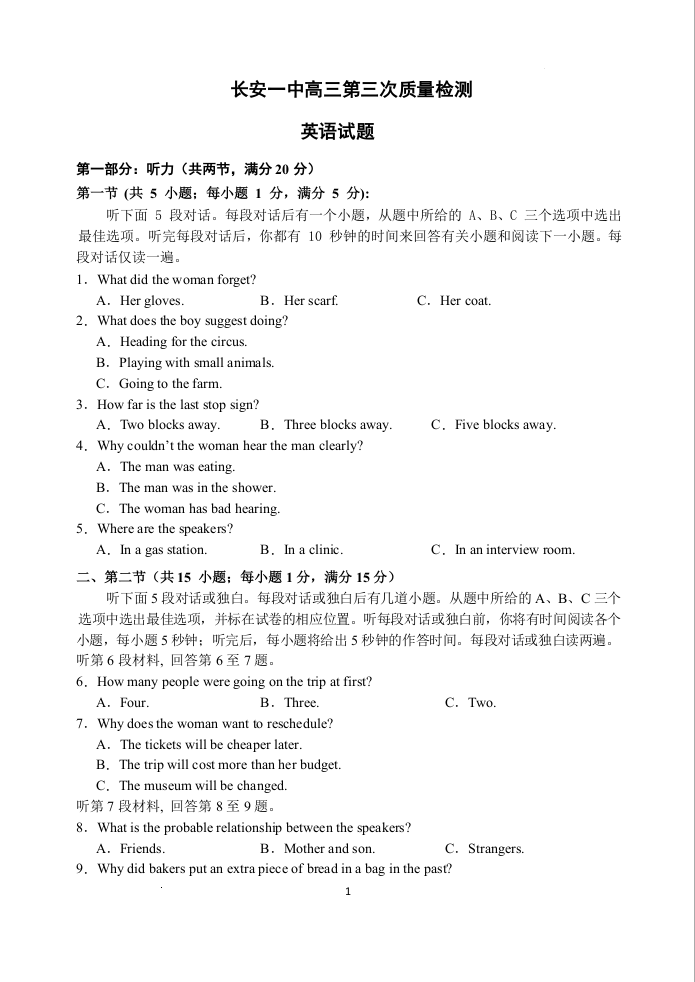 陕西省西安市长安区第一中学2024届高三上学期第三次教学质量检测英语