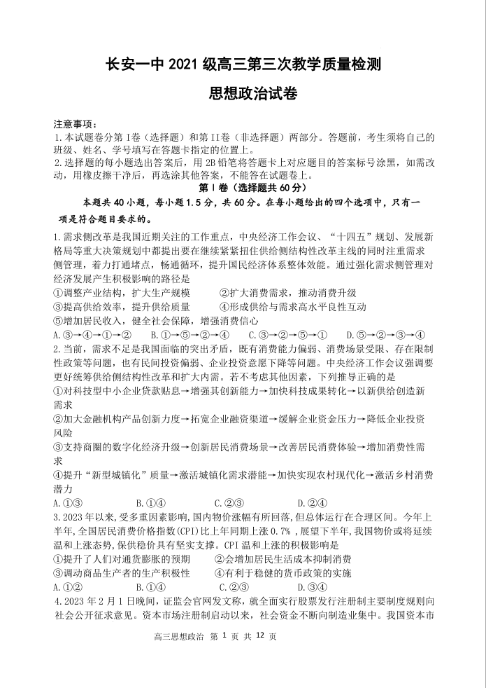 陕西省西安市长安区第一中学2024届高三上学期第三次教学质量检测政治
