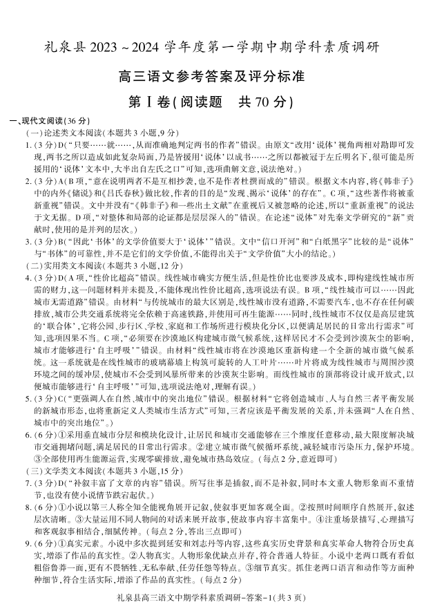 陕西省咸阳市礼泉县2024届高三第一学期中期学科素质调研语文答案