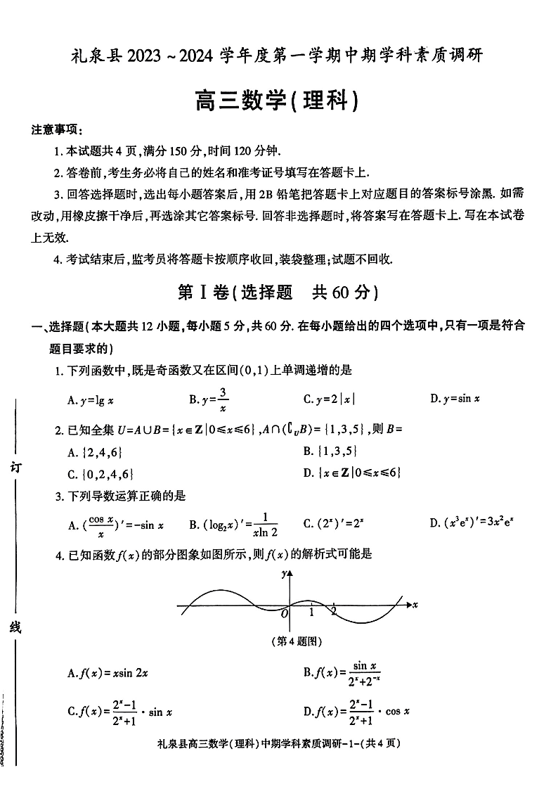 陕西省咸阳市礼泉县2024届高三第一学期中期学科素质调研理科数学