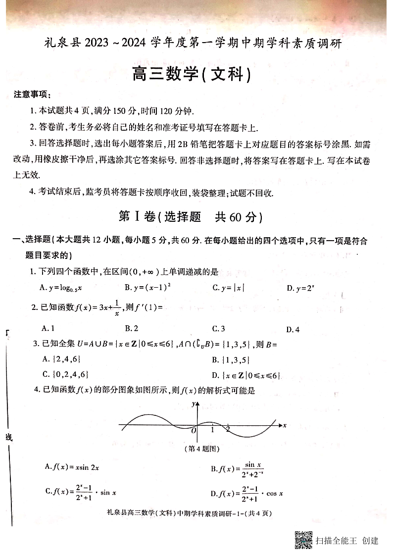 陕西省咸阳市礼泉县2024届高三第一学期中期学科素质调研文科数学