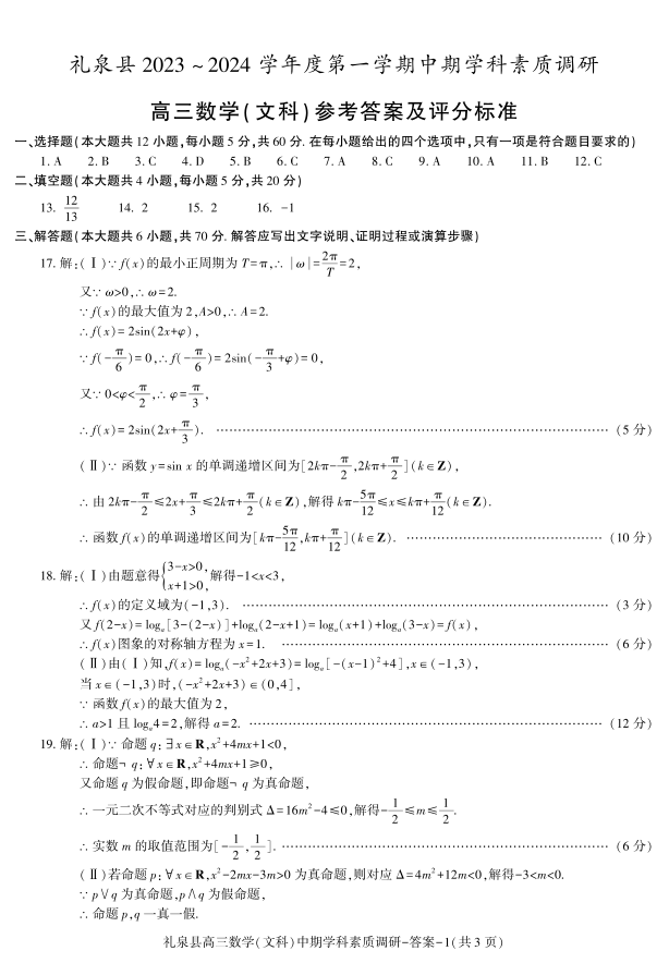 陕西省咸阳市礼泉县2024届高三第一学期中期学科素质调研文科数学答案