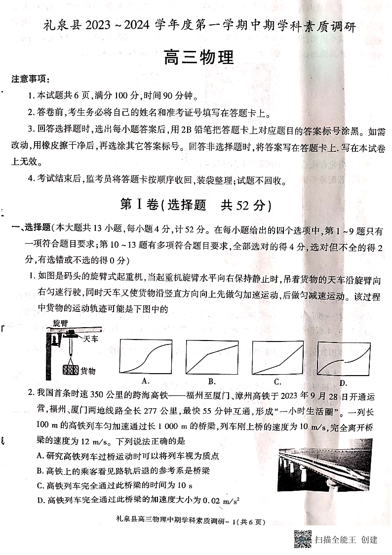 陕西省咸阳市礼泉县2024届高三第一学期中期学科素质调研物理