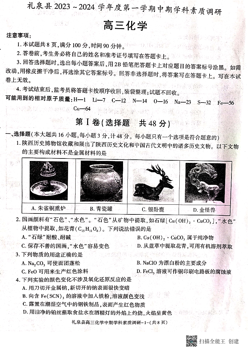 陕西省咸阳市礼泉县2024届高三第一学期中期学科素质调研化学