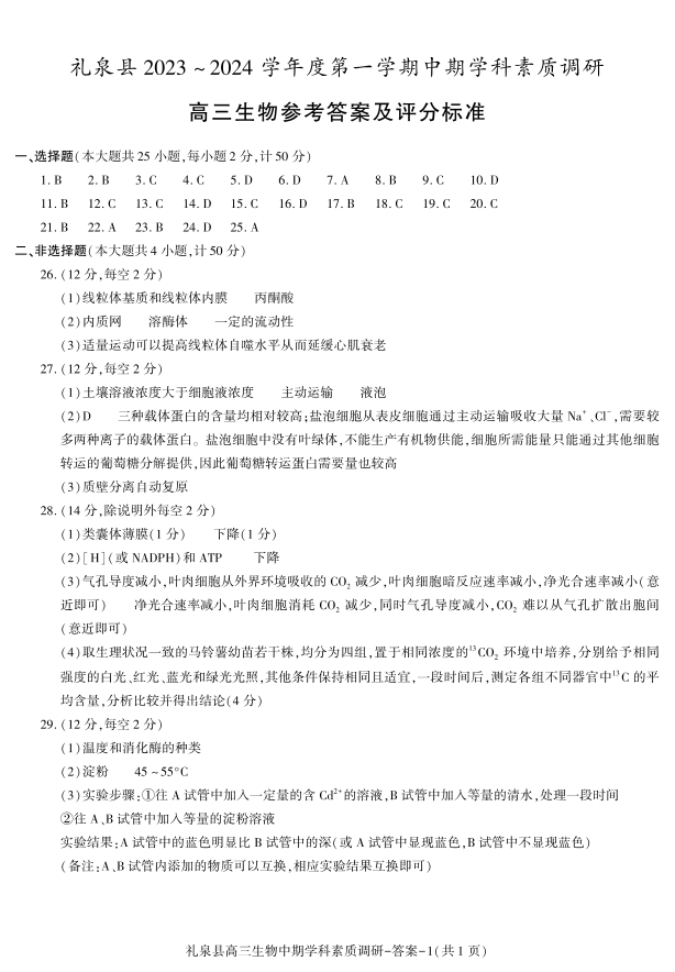 陕西省咸阳市礼泉县2024届高三第一学期中期学科素质调研生物答案