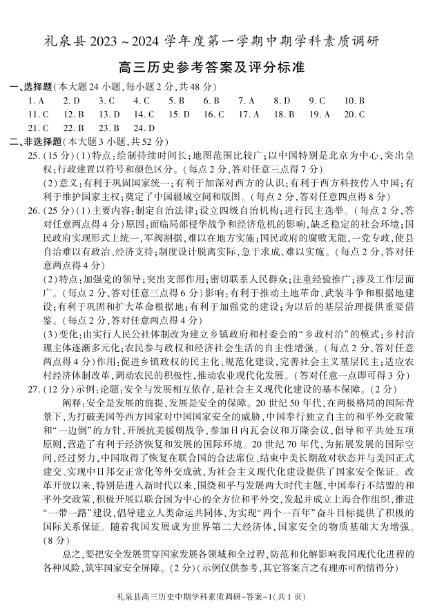 陕西省咸阳市礼泉县2024届高三第一学期中期学科素质调研历史答案