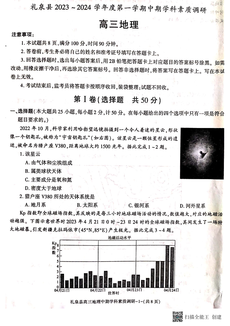 陕西省咸阳市礼泉县2024届高三第一学期中期学科素质调研地理