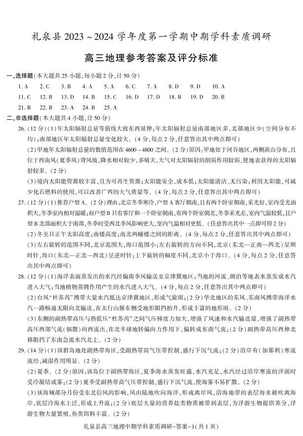 陕西省咸阳市礼泉县2024届高三第一学期中期学科素质调研地理答案