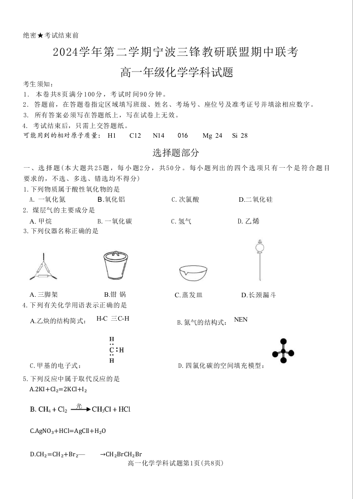 浙江省三锋联盟2024-2025学年下学期4月高一期中考试化学+答案