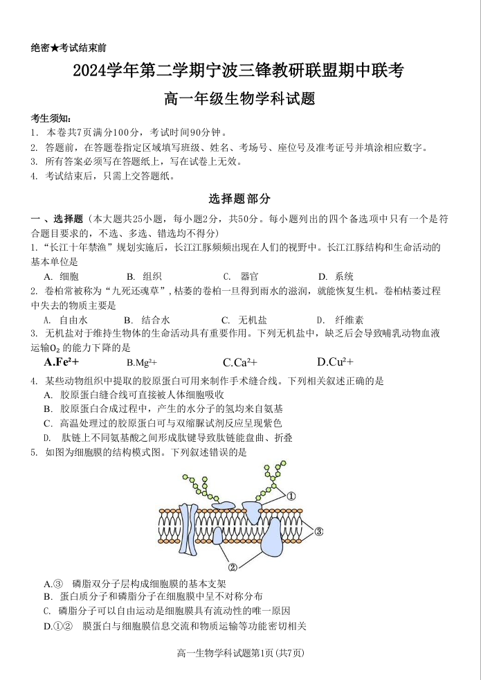 浙江省三锋联盟2024-2025学年下学期4月高一期中考试生物+答案