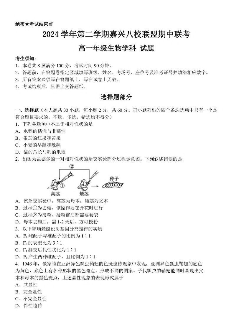 浙江省嘉兴市八校2024-2025学年下学期4月高一期中联考生物+答案