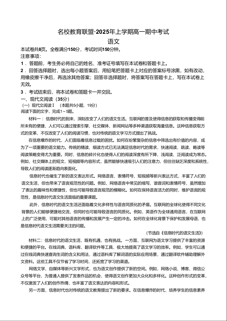 湖南省三湘名校教育联盟2024-2025学年下学期高一期中考试语文+答案