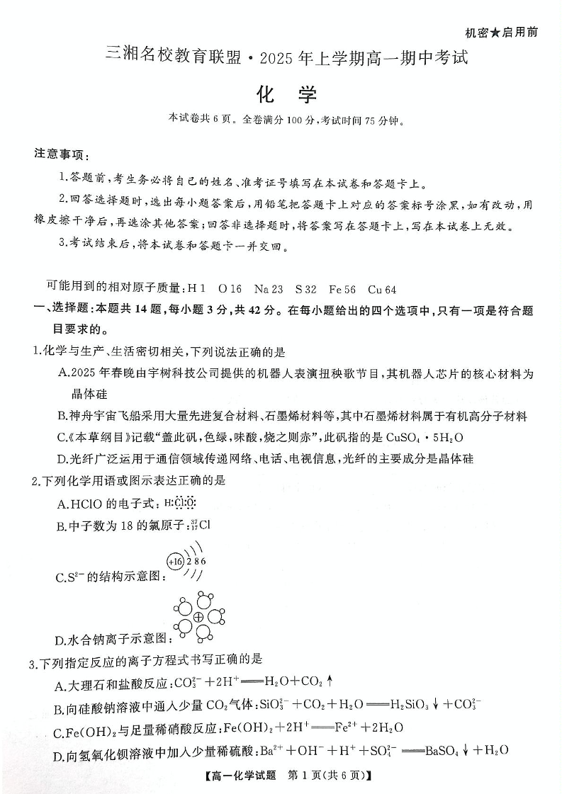 湖南省三湘名校教育联盟2024-2025学年下学期高一期中考试化学