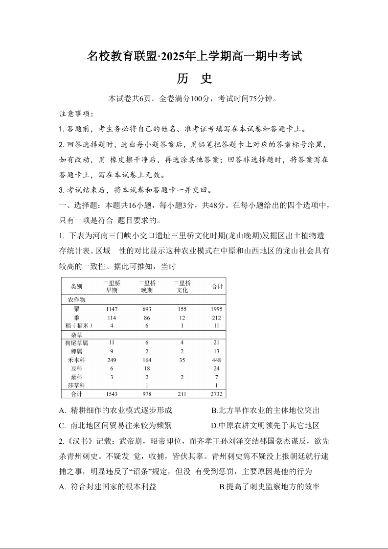 湖南省三湘名校教育联盟2024-2025学年下学期高一期中考试历史