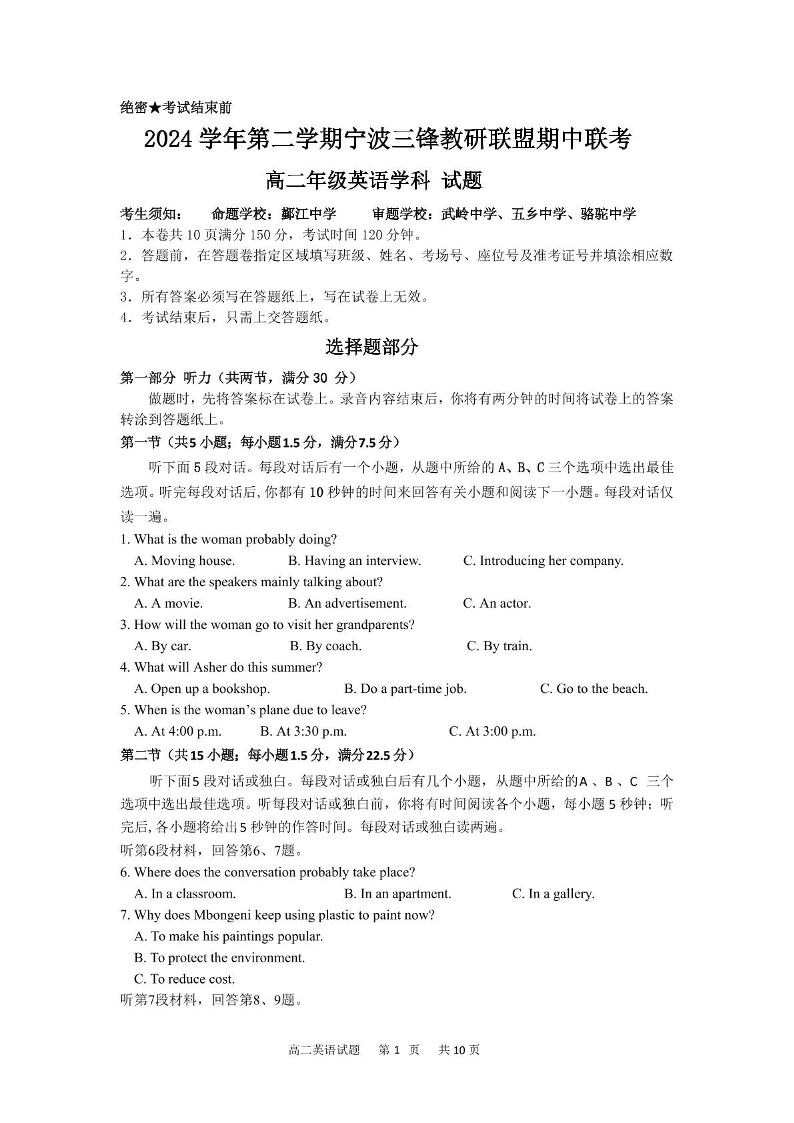 浙江省三锋联盟2024-2025学年下学期4月高二期中考试英语+答案