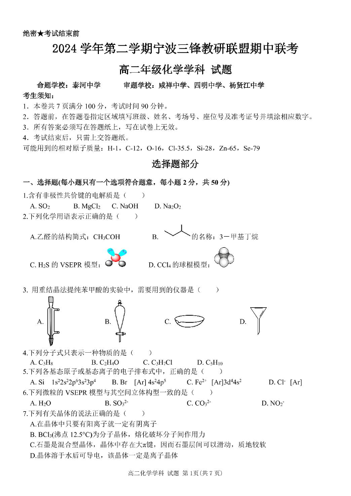 浙江省三锋联盟2024-2025学年下学期4月高二期中考试化学+答案