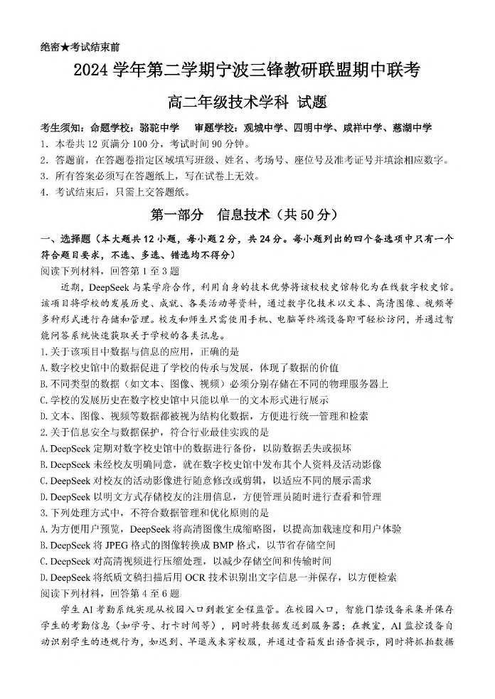 浙江省三锋联盟2024-2025学年下学期4月高二期中考试信息技术+答案