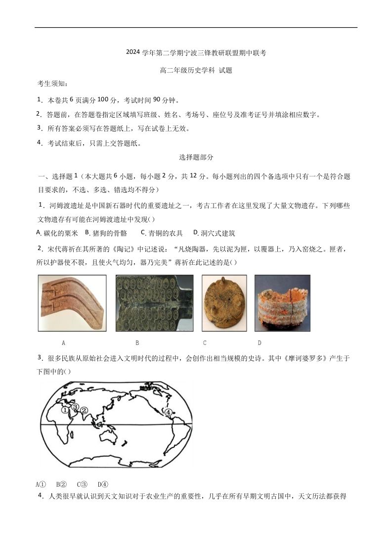 浙江省三锋联盟2024-2025学年下学期4月高二期中考试历史+答案