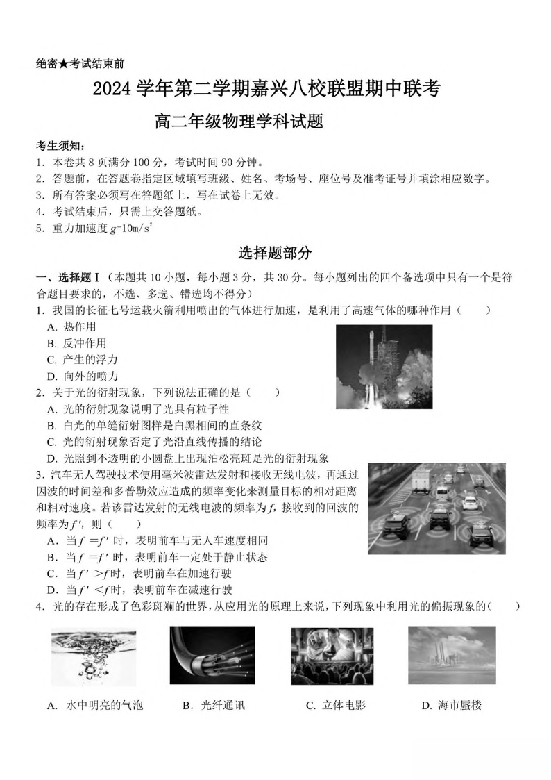 浙江省嘉兴市八校2024-2025学年下学期4月高二期中联考物理+答案