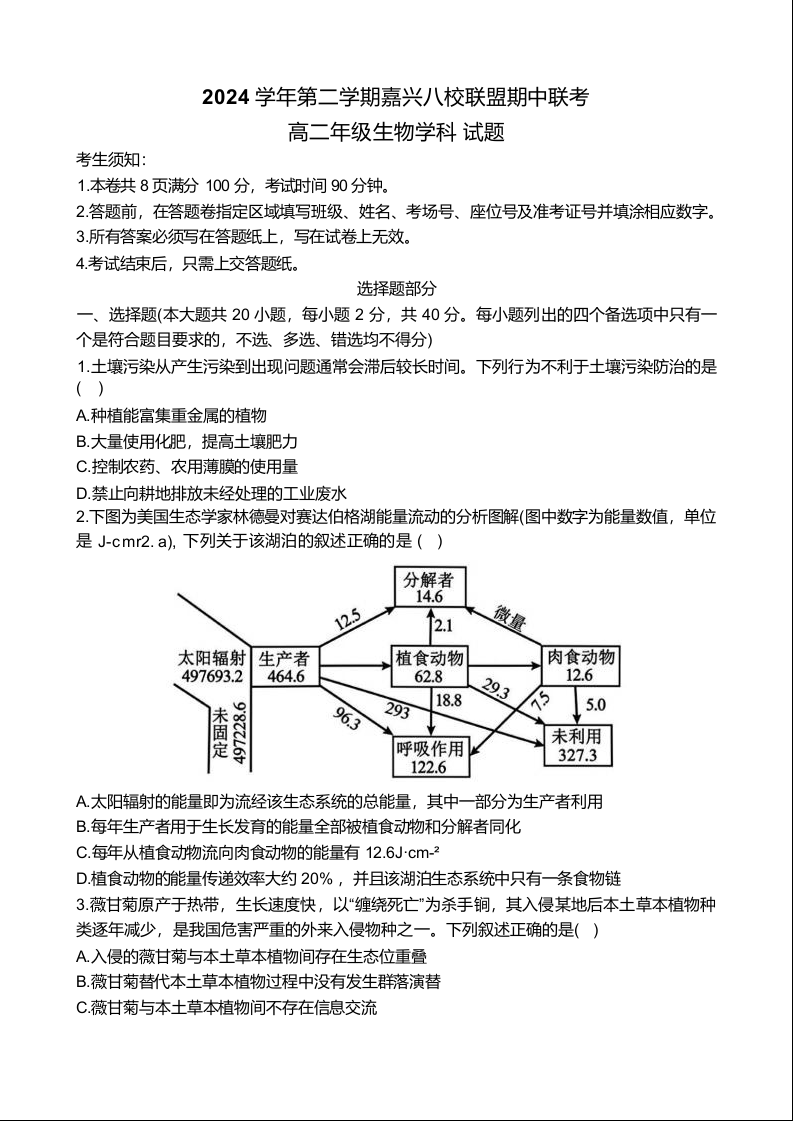 浙江省嘉兴市八校2024-2025学年下学期4月高二期中联考生物+答案
