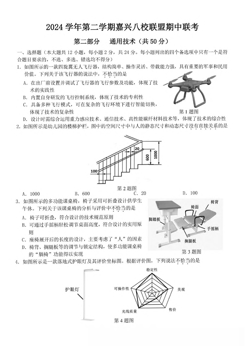 浙江省嘉兴市八校2024-2025学年下学期4月高二期中联考通用技术+答案