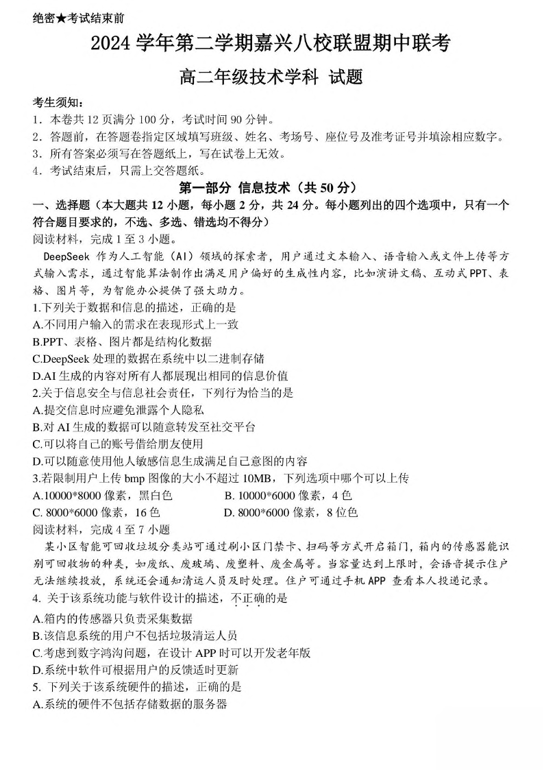 浙江省嘉兴市八校2024-2025学年下学期4月高二期中联考信息技术+答案
