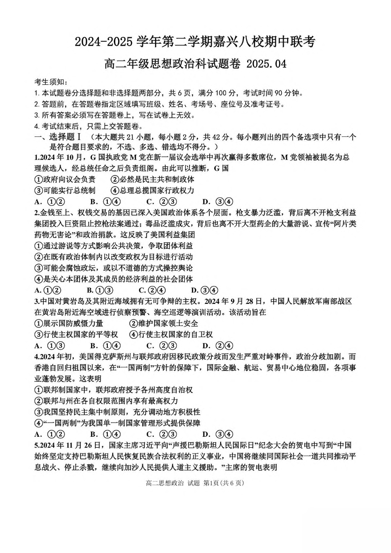 浙江省嘉兴市八校2024-2025学年下学期4月高二期中联考政治+答案