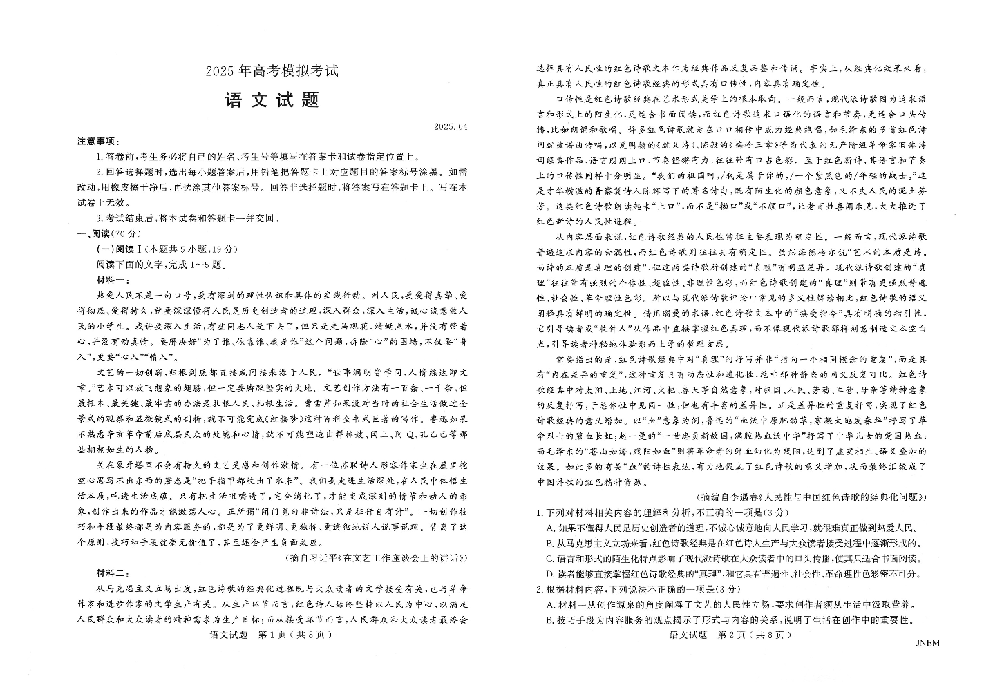 山东省济宁市2024-2025学年下学期4月高三二模统考语文