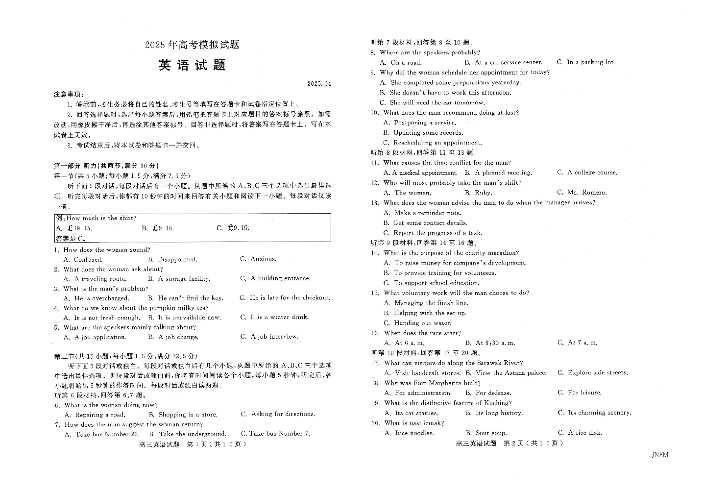 山东省济宁市2024-2025学年下学期4月高三二模统考英语