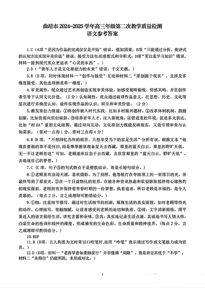 云南省曲靖市2024-2025学年高三年级第二次教学质量检测语文答案