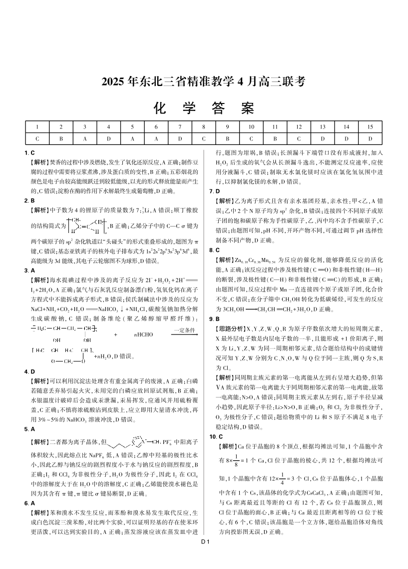 东北三省精准教学2024-2025学年下学期4月高三联考化学答案