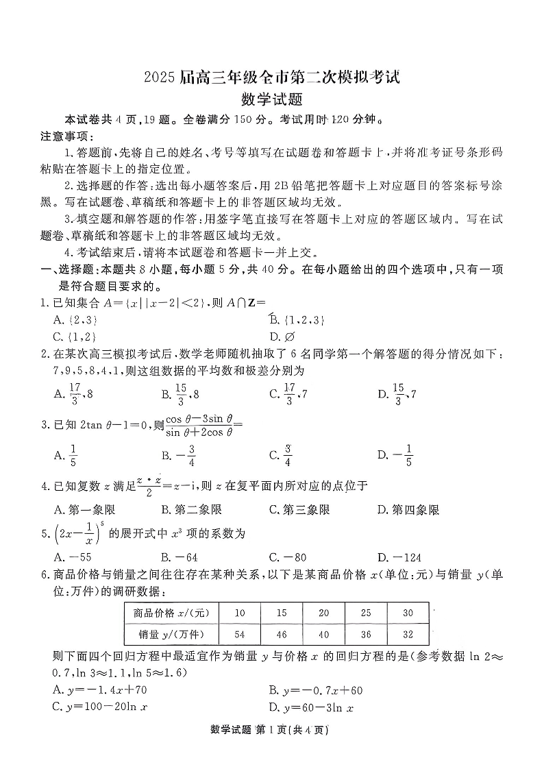 河北省张家口市2025届高三年级全市第二次模拟考试数学