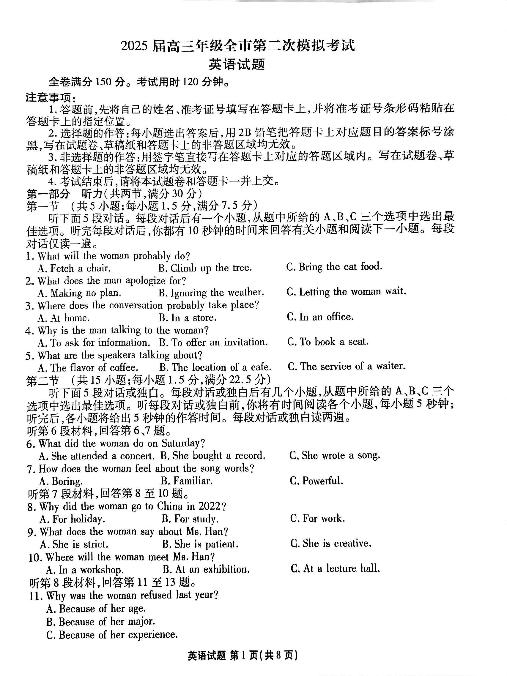 河北省张家口市2025届高三年级全市第二次模拟考试英语