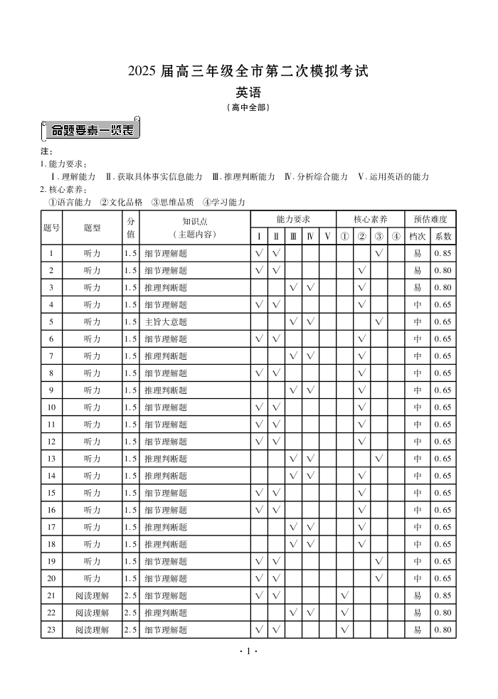 河北省张家口市2025届高三年级全市第二次模拟考试英语答案