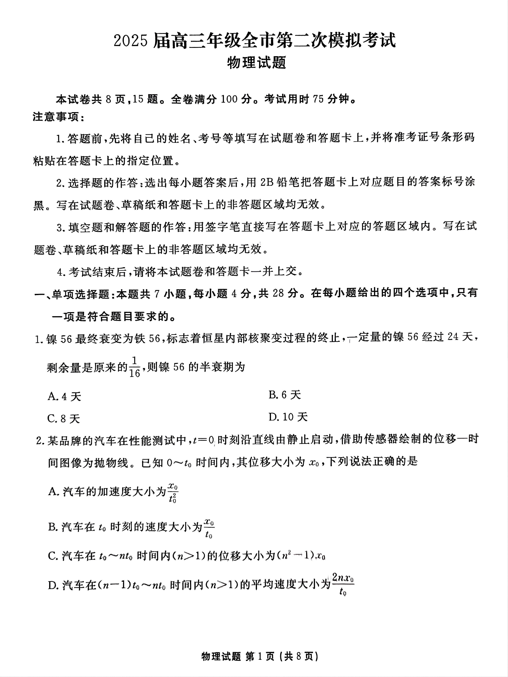 河北省张家口市2025届高三年级全市第二次模拟考试物理
