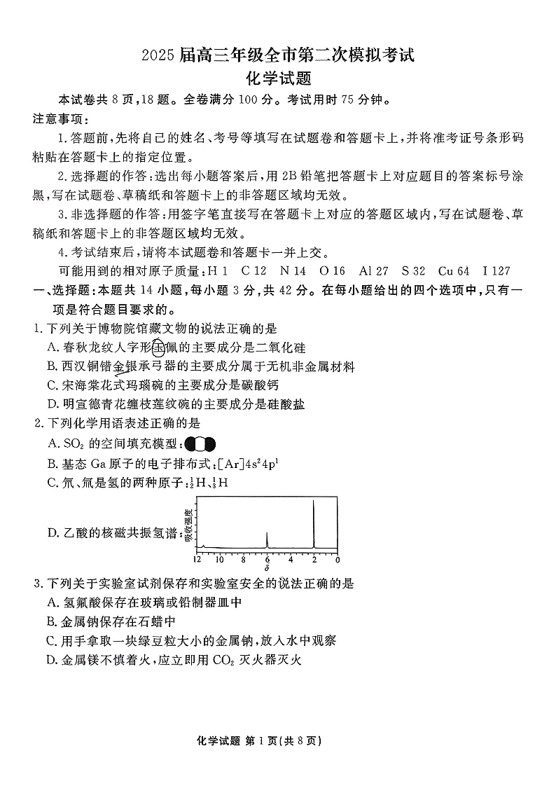 河北省张家口市2025届高三年级全市第二次模拟考试化学